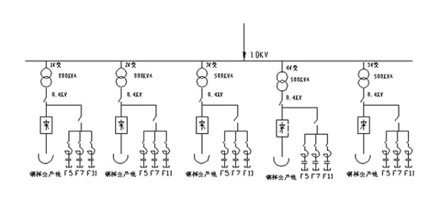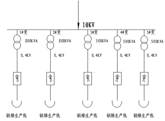 公司由一路10KV進線,廠內安裝800KVA整流變壓器2臺,500KVA整流變壓器3臺,均為10KV/0.4KV。5臺整流變壓器分別帶3條預應力鋼棒熱處理生產線,如下圖: