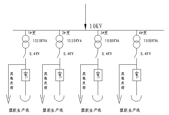 塑膠生產(chǎn)線車間以0.4kV電壓供電,其主要負荷為6脈動整流變頻器、直流電機整流柜,整流設備在工作中在把交流變?yōu)橹绷鞯耐瑫r產(chǎn)生大量的諧波,屬典型諧波源;諧波電流注入電網(wǎng),在電網(wǎng)阻抗上產(chǎn)生諧波電壓,引起電網(wǎng)電壓電流畸變,影響供電質量及運行安全,使線路損耗及電壓偏移增加,對電網(wǎng)和工廠本身電氣設備均會產(chǎn)生不良的影響。