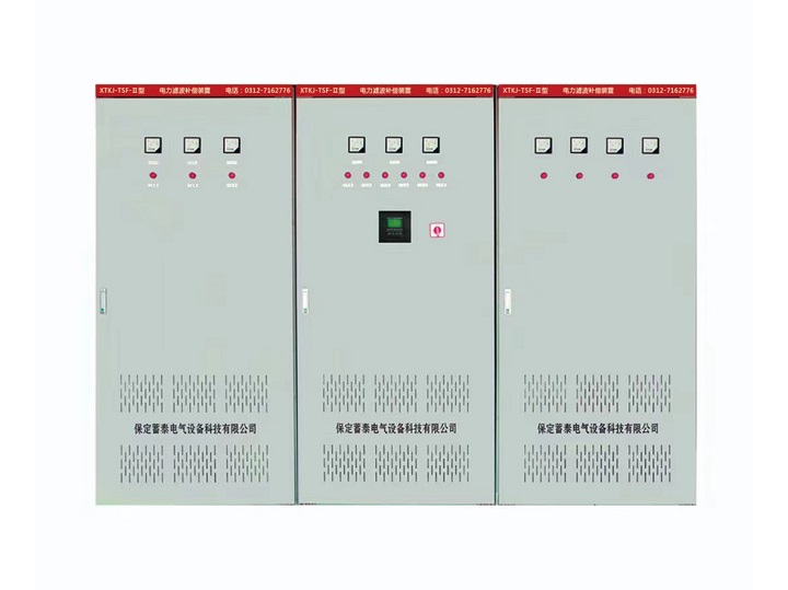 XTKJ-TSF II型電力濾波補償裝置利用微電腦控制器跟蹤系統無功負荷的變化,自動判斷投切,優化濾波支路投入,保持目標功率因數。主回路采用晶閘管組閥投切濾波補償支路的控制方式,濾波補償支路由專業設計制造的濾波電抗器、濾波電容器、晶閘管組閥、斷路器等器件組成,就地進行濾波補償,抑制特定頻率的諧波,補償無功功率,提高功率因數。